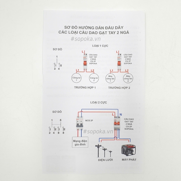 - Loại thiết bị: Cầu dao gạt tay 2 ngã (đóng/ngắt/đổi nguồn bằng tay).